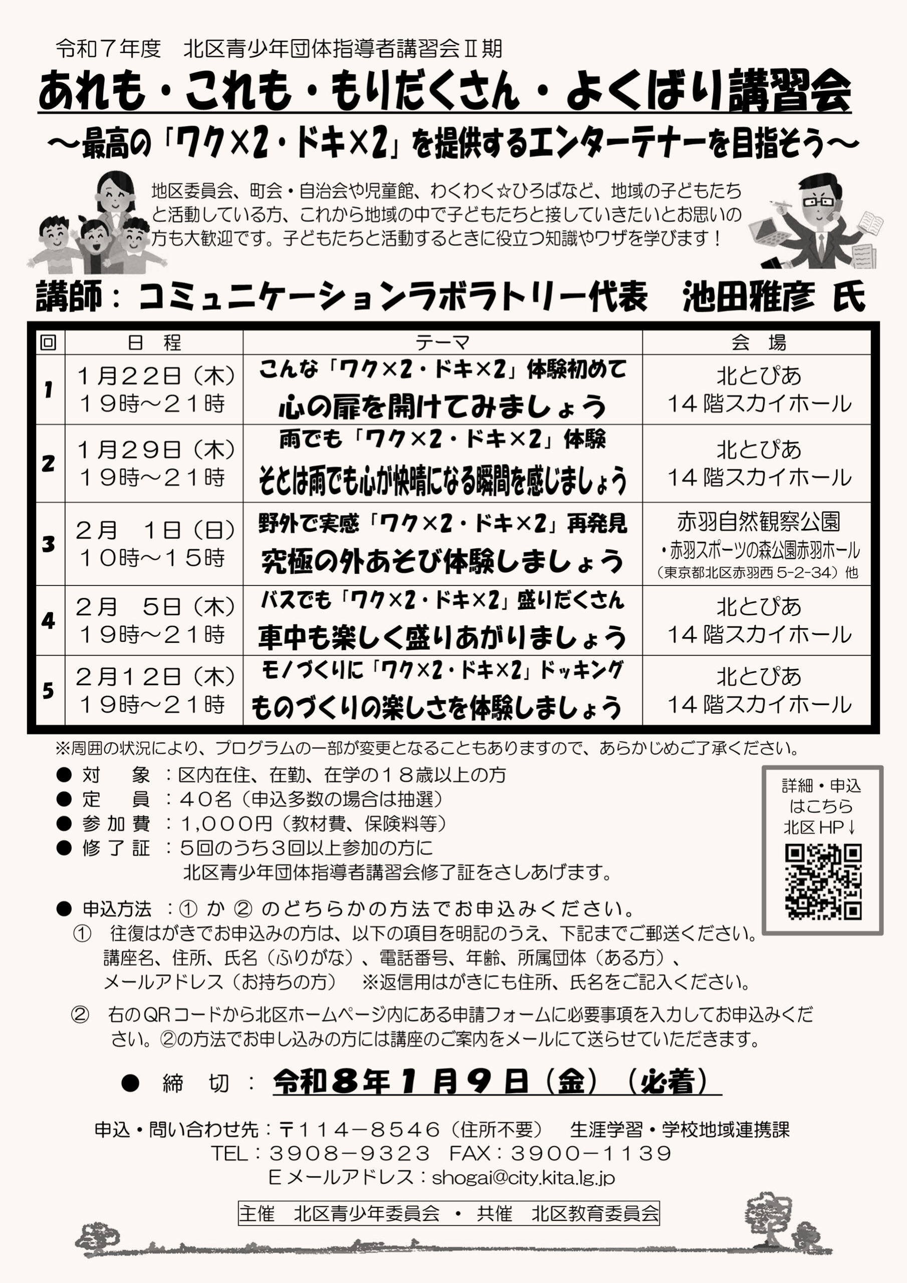 地区委員会、町会・自治会や児童館、わくわく☆ひろばなど、地域の子どもたちと活動している方、これから地域の中で子どもたちと接していきたいとお思いの方も大歓迎です。子どもたちと活動するときに役立つ知識やワザを学びます!