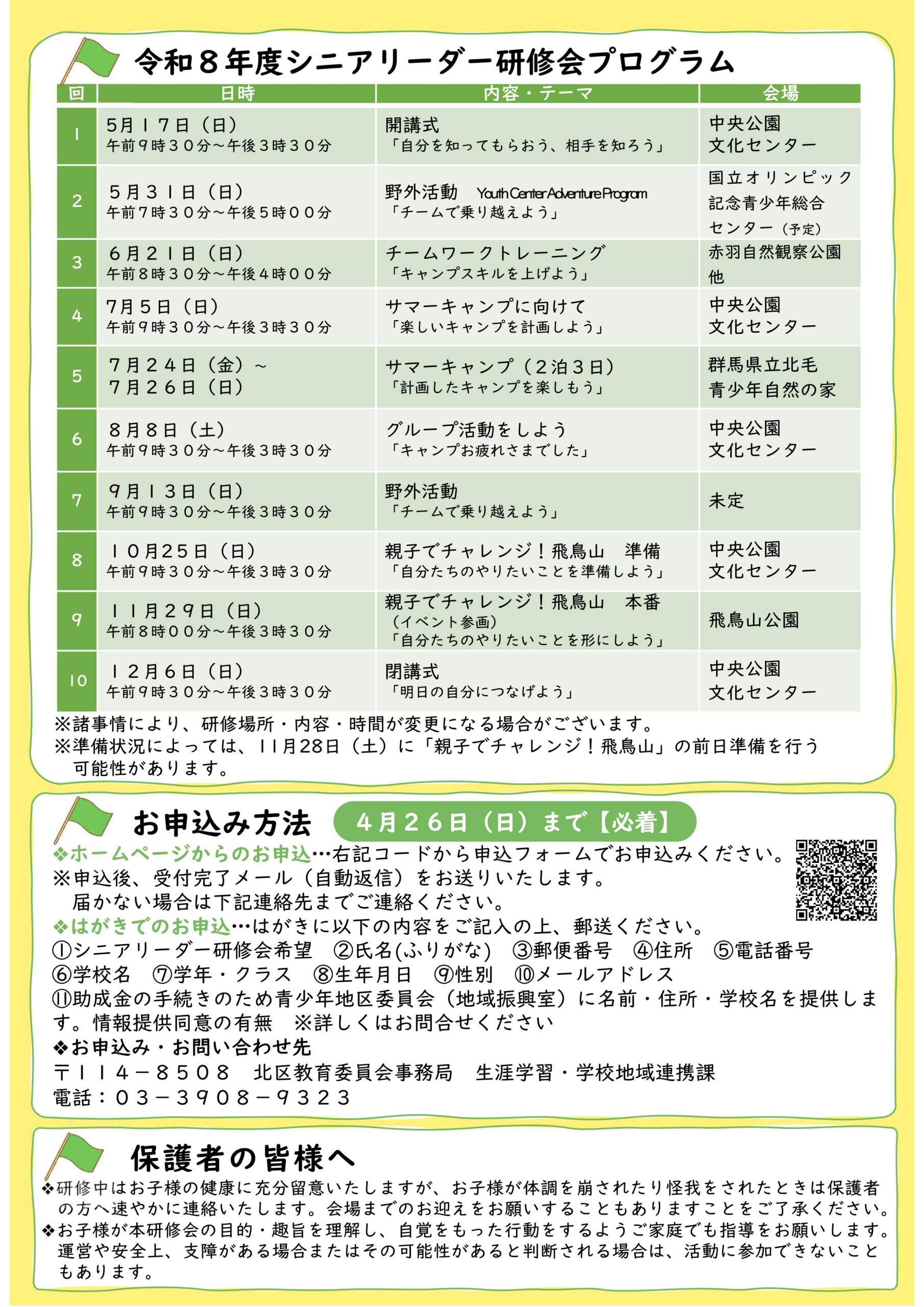 往信面の裏に「1.シニアリーダー研修会希望、2.氏名(ふりがな)、3.郵便番号、4.住所、5.電話番号、6.学校名、7.学年・クラス、8.生年月日、9.性別、10.ある方はEメールアドレス、11.情報提供の承諾(助成金の手続きのため、該当の地区青少年委員会(地域振興室)に名前・住所・学校名の情報を提供します。 ※詳しくはお問い合わせください。)」を記入し、返信宛名面に参加者本人の住所、氏名を記入して、〒114-8508 (住所不要) 北区教育委員会事務局生涯学習・学校地域連携課宛にお送りください。